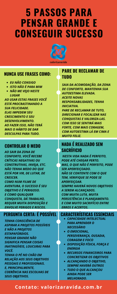 Olá, como vai? Sem perceber, desiste dos seus projetos mesmo antes de tentar realiza-los, saiba que isto é muito comum, neste artigo você encontrará “5 passos para pensar grande e conseguir sucesso” e como aplica-los na sua vida pessoal e profissional :